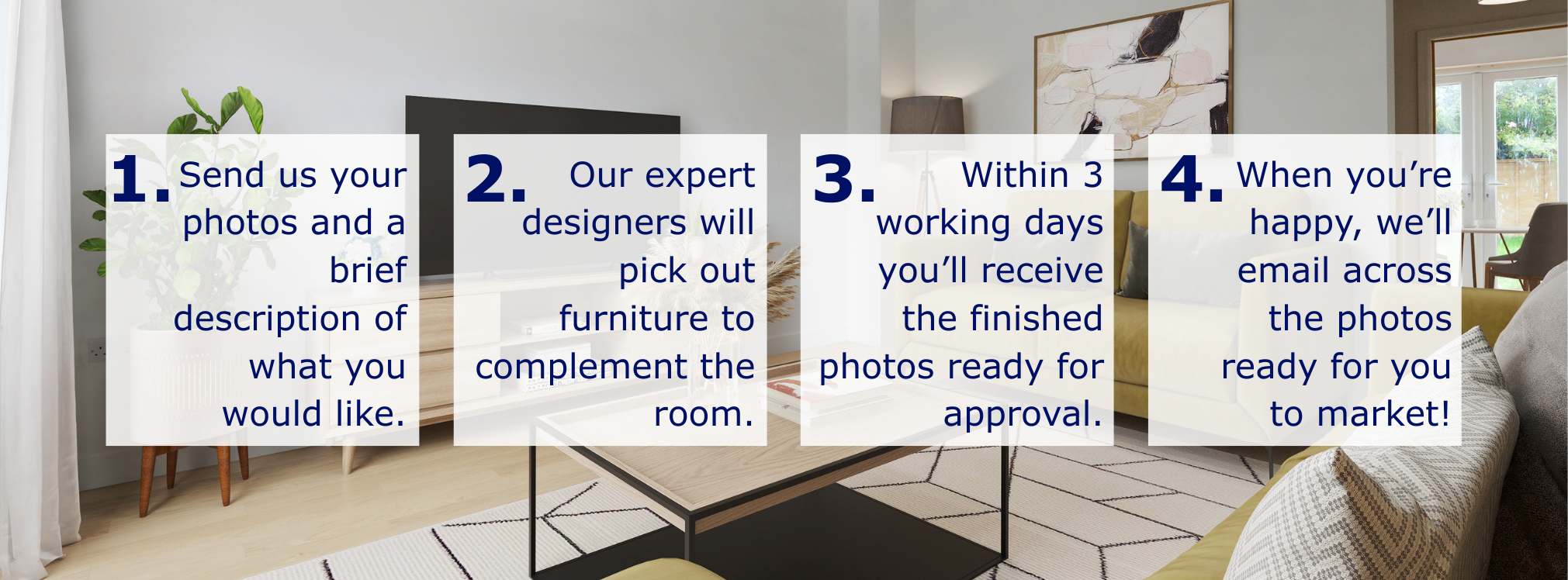 Our virtual staging service is easy and utilises our own experience with design and popular interior trends to produce gorgeous looking rooms. We suggest that our clients use professional photographs to get the best results, however we can work with high resolution smartphone photos. Please bear in mind, the better the initial photos, the better the end product.